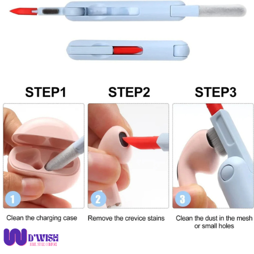🎧 Specialized Air Pods Cleaner Pen: Features a silicone tip for crevices, flock sponge for charging cases, and a mini brush for deep mesh cleaning — perfect for delicate audio gear.